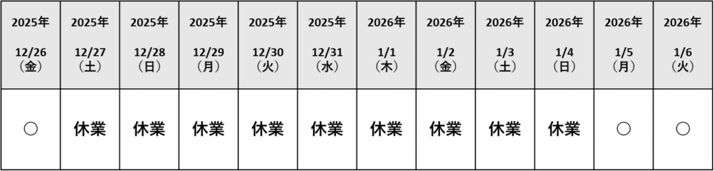 年末年始休業期間は2025年12月27日(土)~2026年1月4日(日)です。